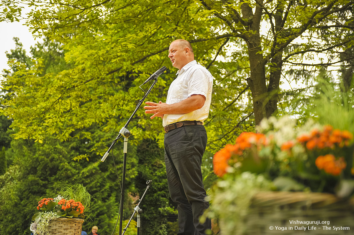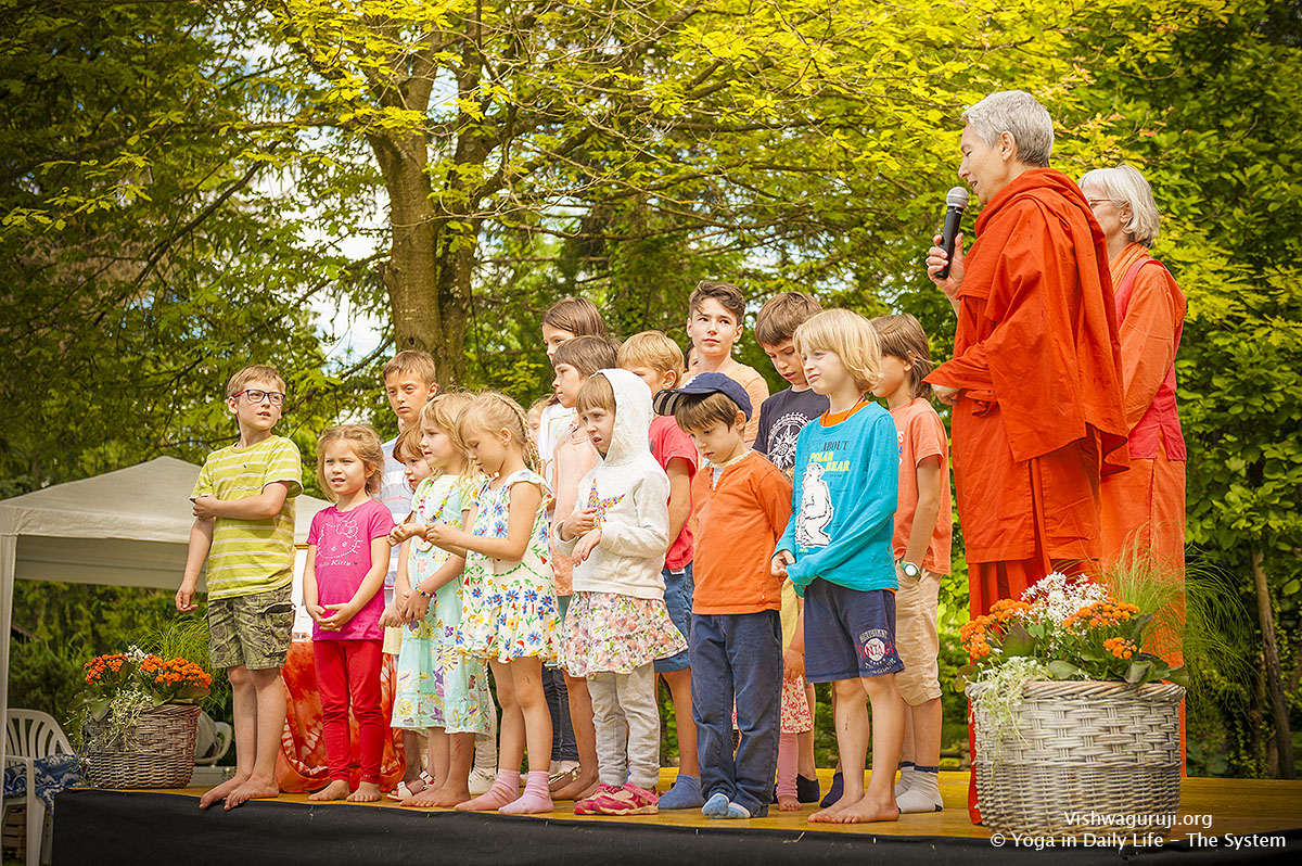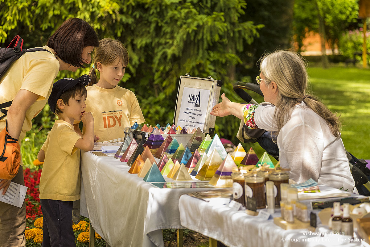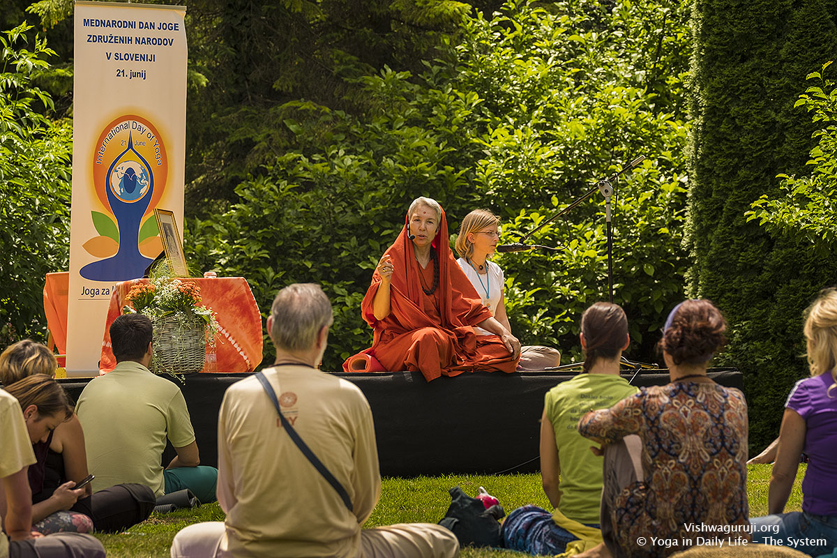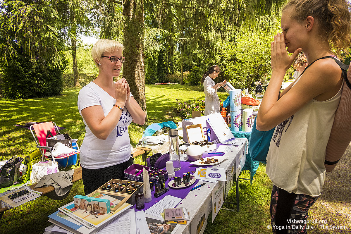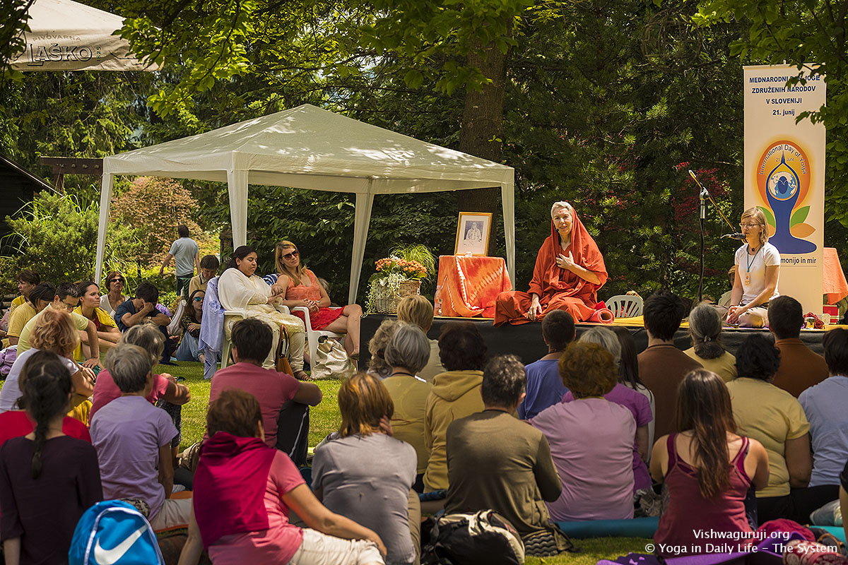 Dan se je pričel z meditacijo, nadaljevas pozdravnimi nagovori g. Jožeta Srake, predsednika Zveze joga društev Slovenije in g. Iva Suhoveršnika, župana občine Mozirje. Prisotna je bila tudi gospa Barthi Gupta, odpravnica poslov Indijske ambasade v Sloveniji. Sledila je vadba na livadi pri čakrah in nato predavanje Swami Umapuri, učiteljice Joge v vsakdanjem življenju in dolgoletna učenka Vishwagurujija Paramhanse Maheshwaranande. Celodnevni program z delavnicami, petjem in jogo so imeli otroci. Sadhvi Savitri iz Kopra je vodila jogo za zlata leta in tudi za tiste najmlajše. Festival so obogatili številni razstavljalci in ponudniki, s predavanji pa tudi Anton Komat, dr. Mani, Marija Kočevar in dr. Biljana Dušić. Nasvidenje naslednjič!