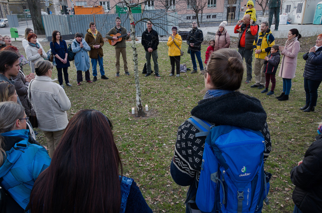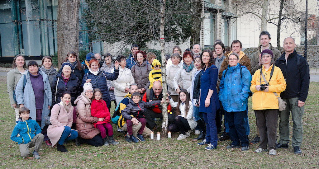 Jogisti iz Ljubljane in okolice, Notranjske in Zasavja, pa še od kje, so se zbrali v nedeljo, 3. marca ob 17.00 pri drevesu miru v parku pri Cankarjevem domu v Ljubljani. Srečni in hvaležni, da uživajo mir in blagostanje, so poslali dobre misli v tiste konce sveta, ki jih pretresajo oboroženi konflikti. Prebrali so Vishwagurujijevo poslanico ob tej priliki in zapeli molitev za mir.