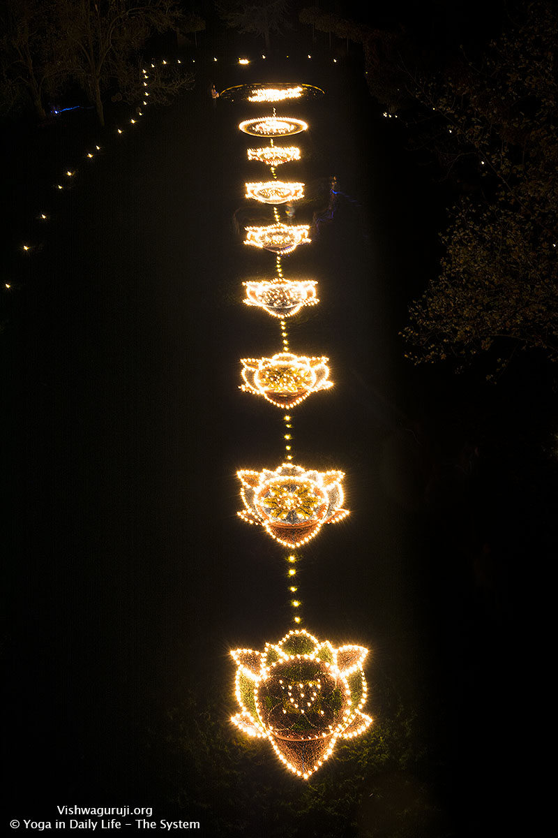 V prečudovitem okolju Mozirskega gaja stoji inštalacija simbolov čaker (energijskih središč telesa). Sicer odeta v barve, je na večer 30. oktobra 2016, zasijala v skoraj 3000 lučkah. Datum ni bil izbran naključno. Svetlobna inštalacija je nastala na pobudo avtorja postavitve simbolov čaker, Etbina Kuharja, prav na Divali. to je praznik, ko hindujski del sveta praznuje zmago svetlobe nad temo, znanja nad nevednostjo. Dan je še posebej pomemben za učence Vishwagurujija, saj je prav na Divali  leta 1828 prišel na svet njihov pra-pra duhovni učitelj Bhagavan Sri Dip Narayan Mahaprabhuji. Fotogalerija in kratek film v nadaljevanju.