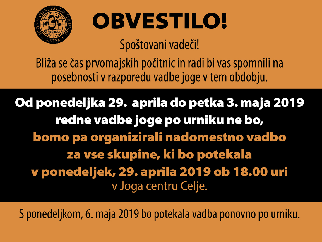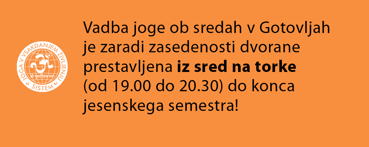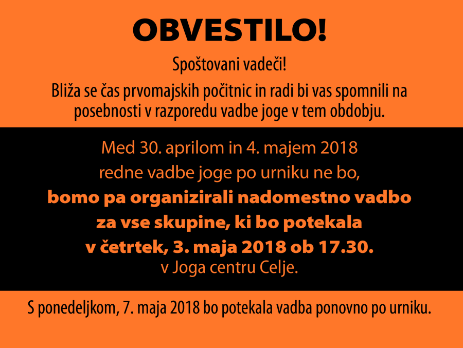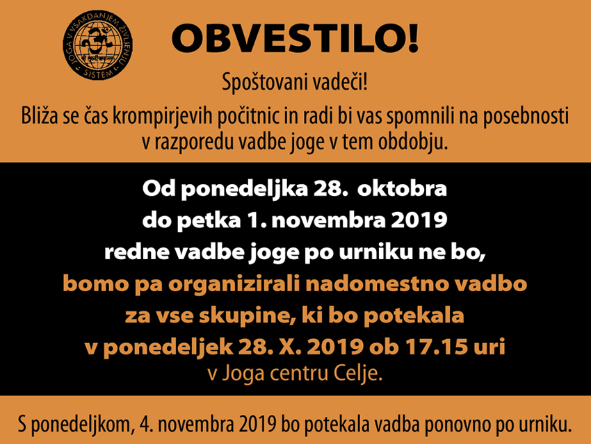 V omenjenem obdobju bomo organizirali nadomestno vadbo joge za vse skupine: